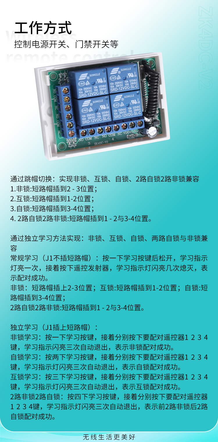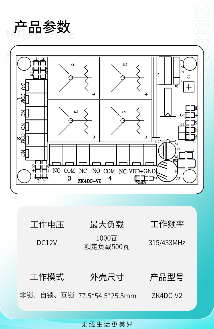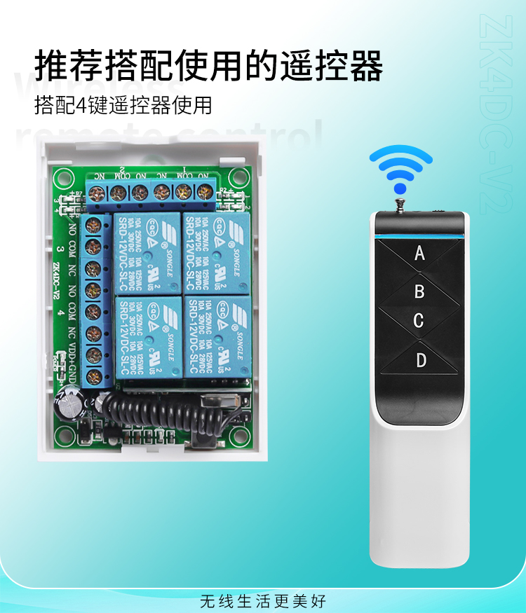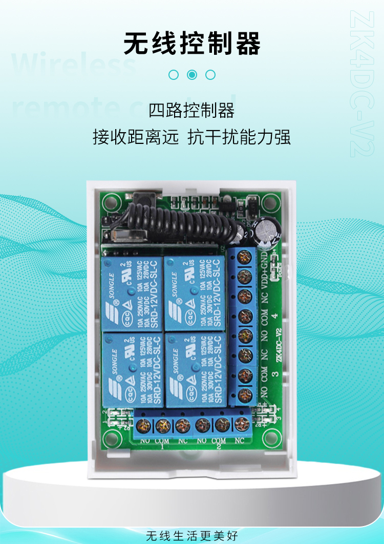 ZK4DC-V2是一款具有四路继电器输出的香妃直播软件下载控制器,工作电压12V,带载能力强