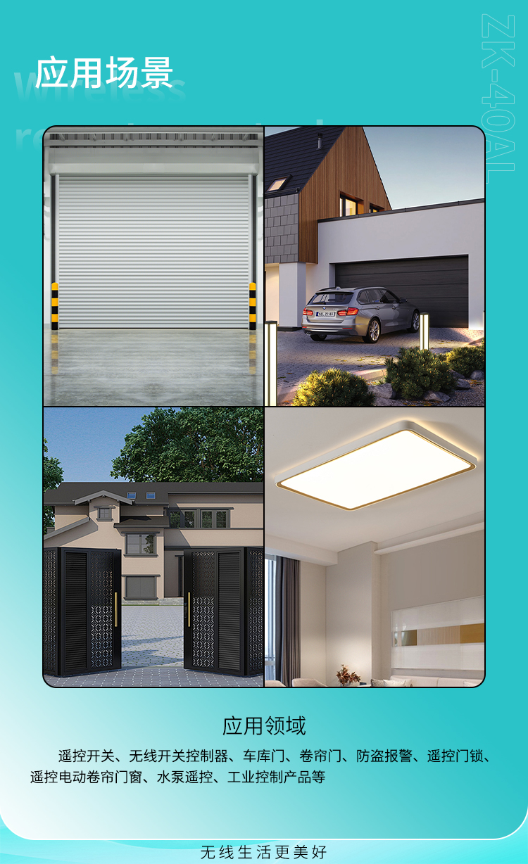 控制家用、办公室、商场、仓库等常用日光灯,遥控电动门、窗、开关、安防等领域。