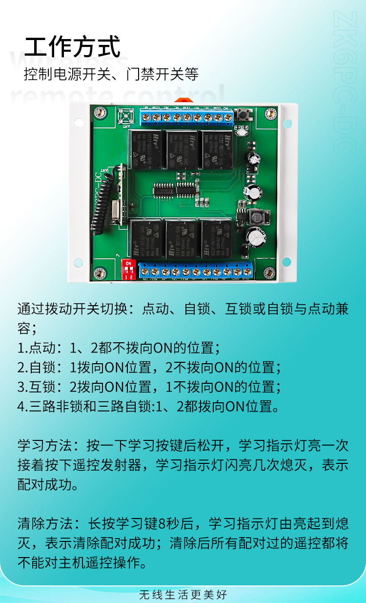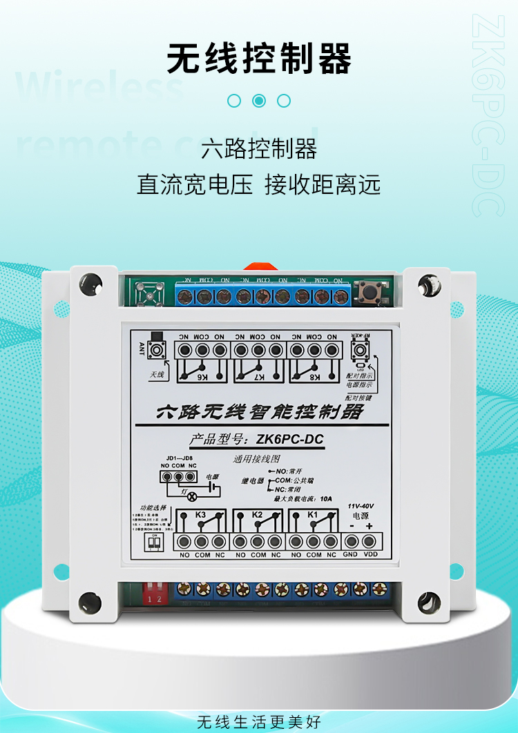 这是一款具有六路继电器输出的香妃直播软件下载遥控智能控制器,主要是面对各种客户使用供电电压不同经常需要改硬件电路去适应客户而做出的调整,目前这款控制器工作电压范围比较宽,在11V~40V工作电压都可以正常工作,更能接近于满足客户供电电压不同的使用问题。