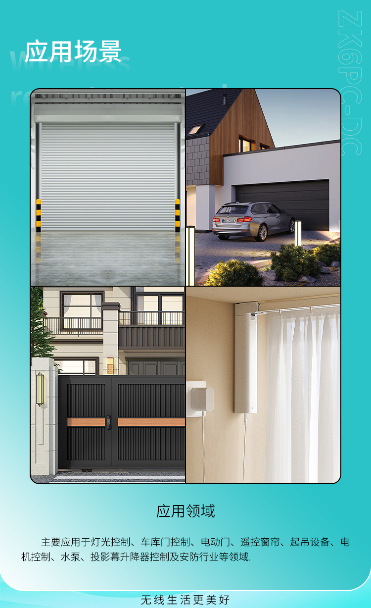 主要香妃视频APP下载安装于灯光控制、车库门控制、电动门、遥控窗帘、起吊设备、电机控制、水泵、投影幕升降器控制及安防行业等领域。