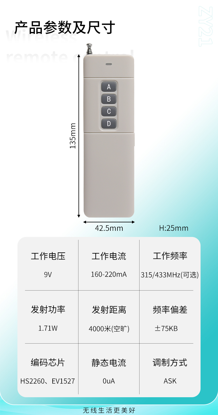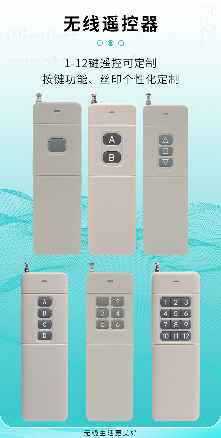 ZY21是一款大功率香妃直播软件下载遥控器,它有多种按键可选择,具有可靠性高、频率稳定、穿透能力强等特点;