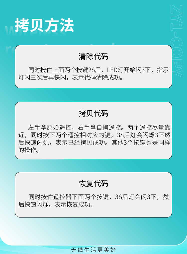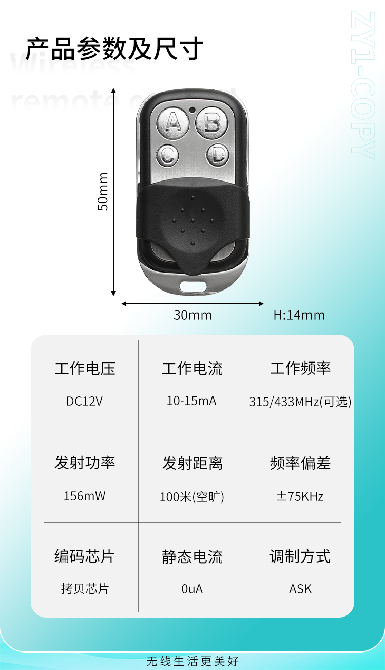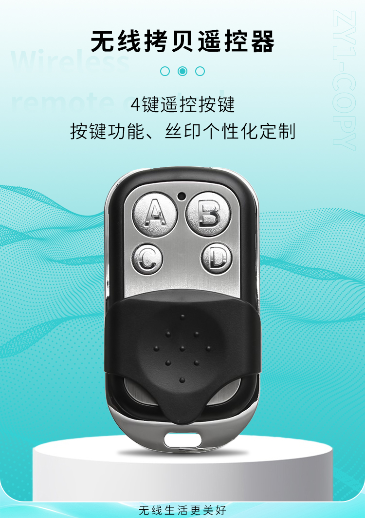 ZY1-COPY 是一款四键对拷遥控器,可拷贝同频率的遥控器,外观精美