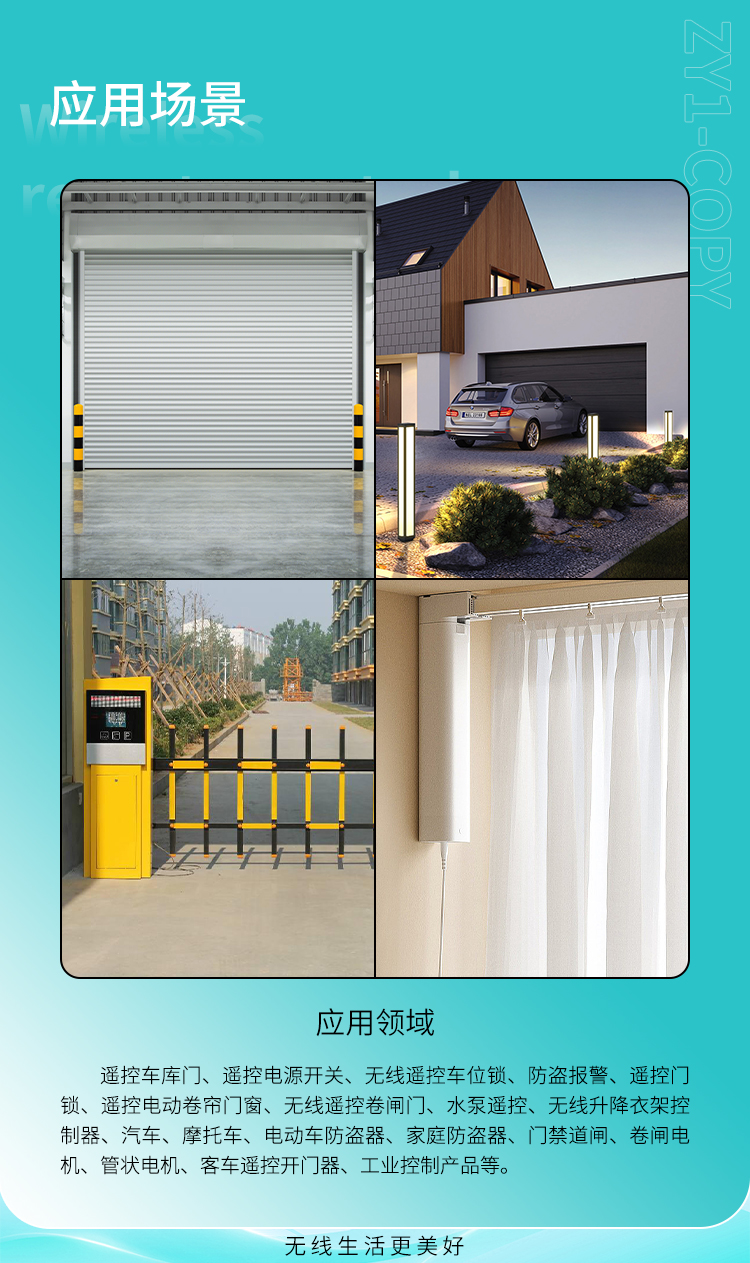 遥控开关、防盗报警、遥控门锁、遥控电动卷帘门窗、水泵遥控、工业控制产品等;