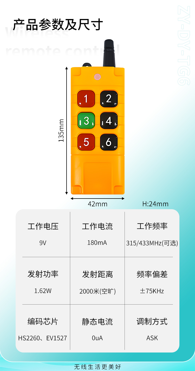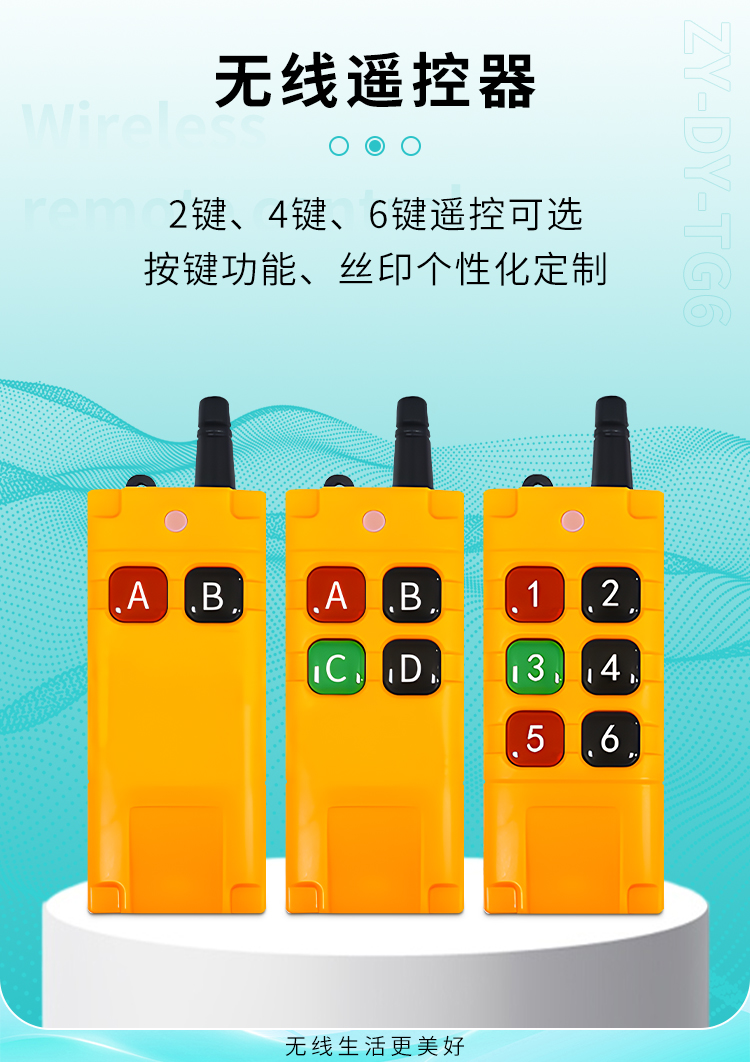 ZY-DY-TG6是一款工业级大功率遥控器,2键4键6键可选,具有可靠性高、频率稳定、穿透能力强等特点;