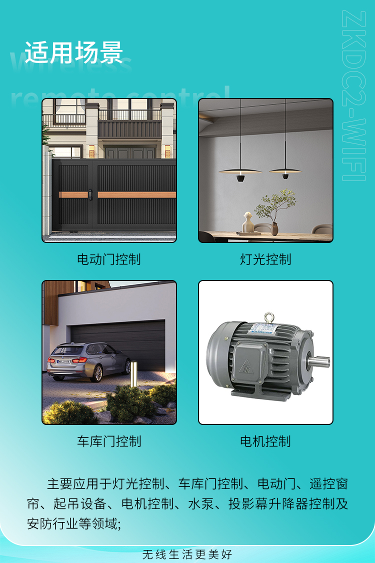 主要香妃视频APP下载安装于灯光控制、车库门控制、电动门、遥控窗帘、起吊设备、电机控制、水泵、投影幕升降器控制及安防行业等领域。