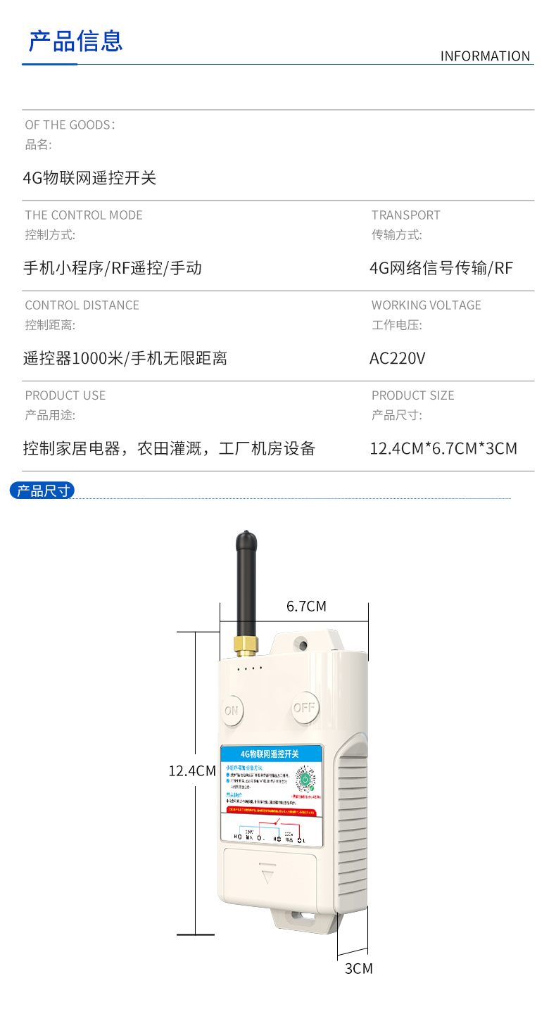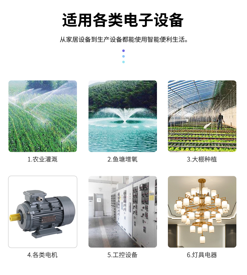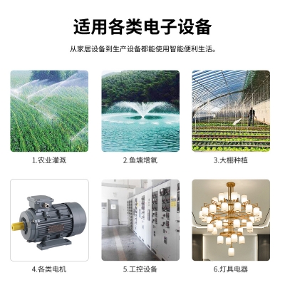 农业灌溉、鱼塘增氧、大棚种植、各类电机、工控设备、灯具电器