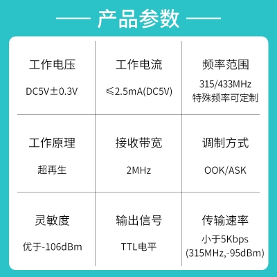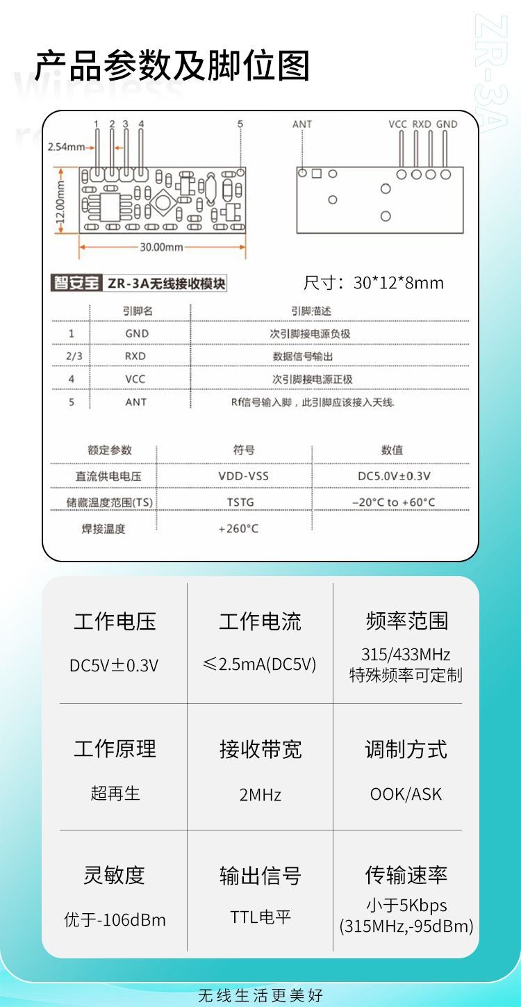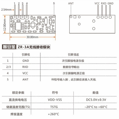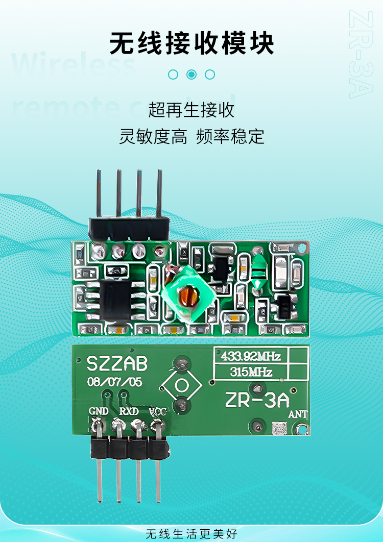 ZR-3A超再生接收模块采用超再生接收电路,线路设计简单,生产方便,生产成本低,体积小,功效超低,所以被广泛使用,这种设计有很多优点,它可以和各种解码电路或者单片机配合,设计电路灵活方便。