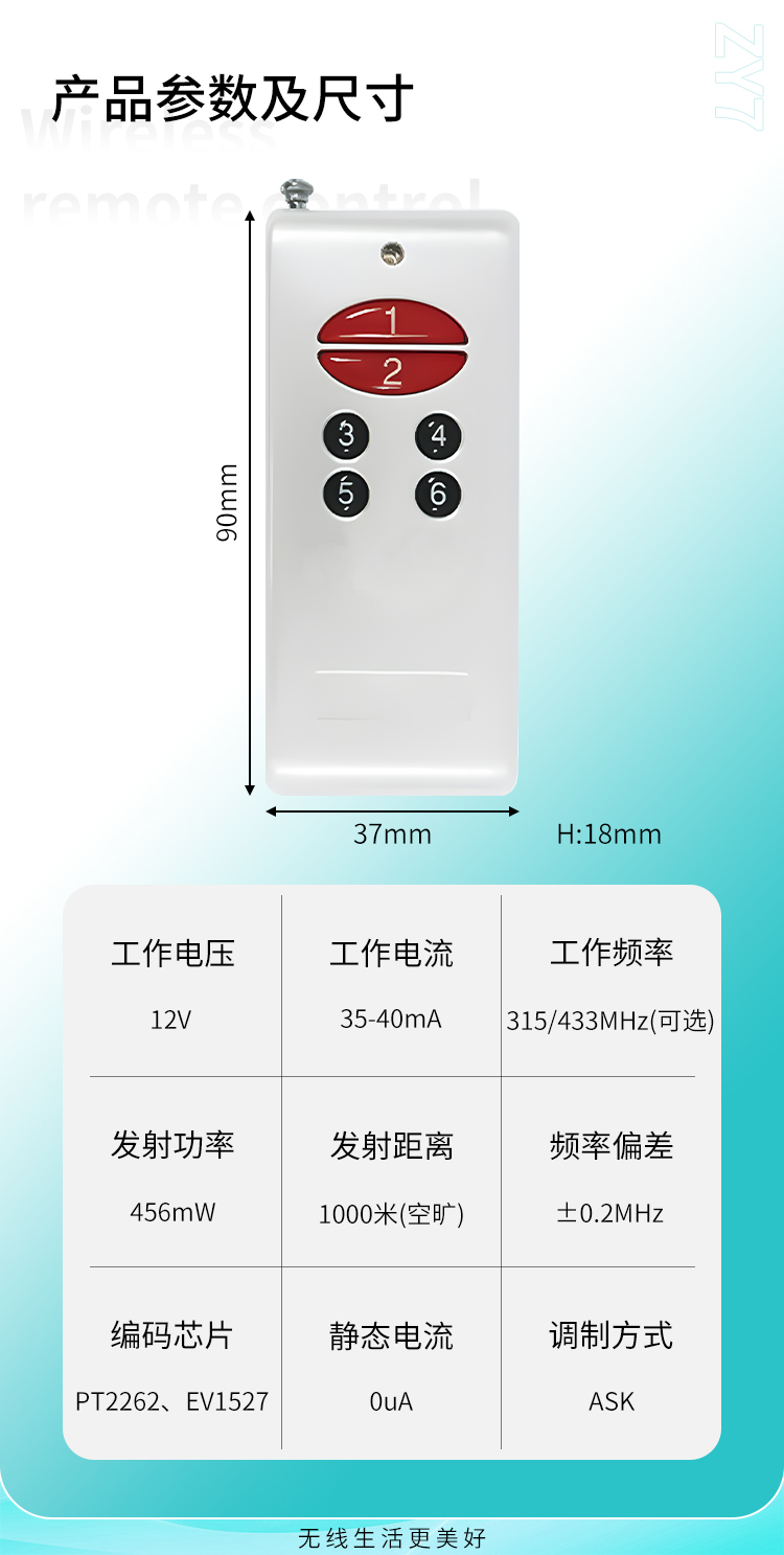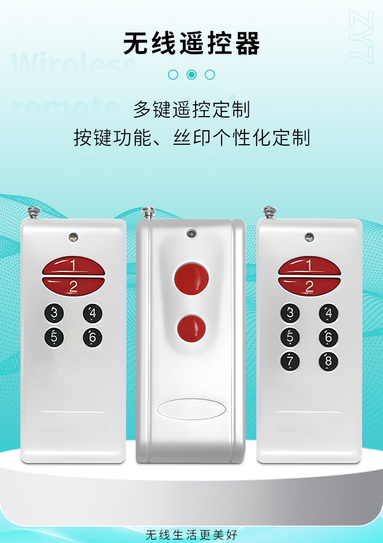 ZY7是一款中功率遥控器,2、6、8键可选,具有可靠性高、频率稳定、穿透能力强等特点;