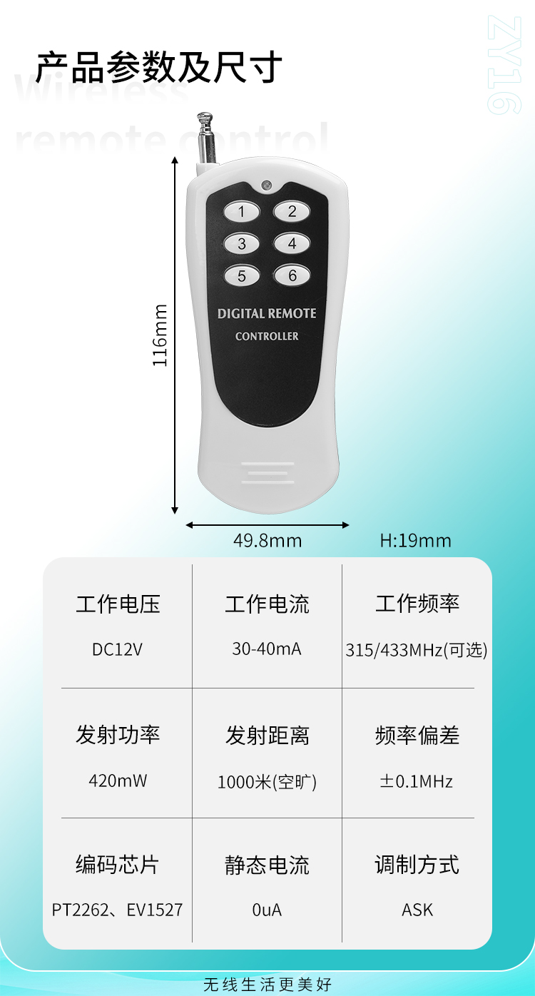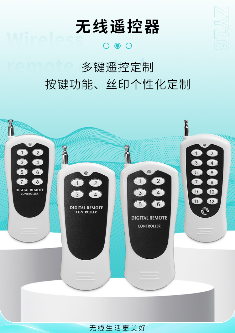 ZY16是一款中功率遥控器,多种按键可选,具有可靠性高、频率稳定、穿透能力强等特点;
