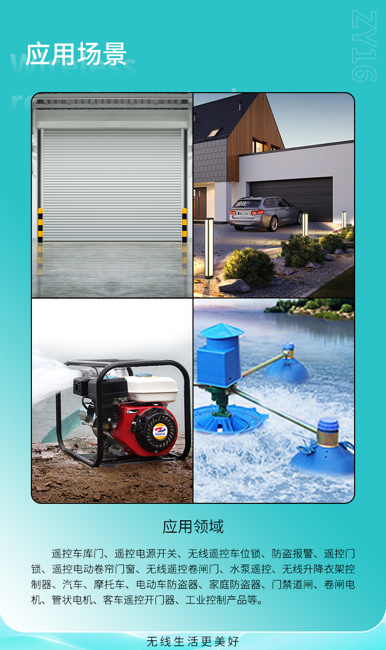 遥控开关、防盗报警、遥控门锁、遥控电动卷帘门窗、水泵遥控、工业控制产品等;