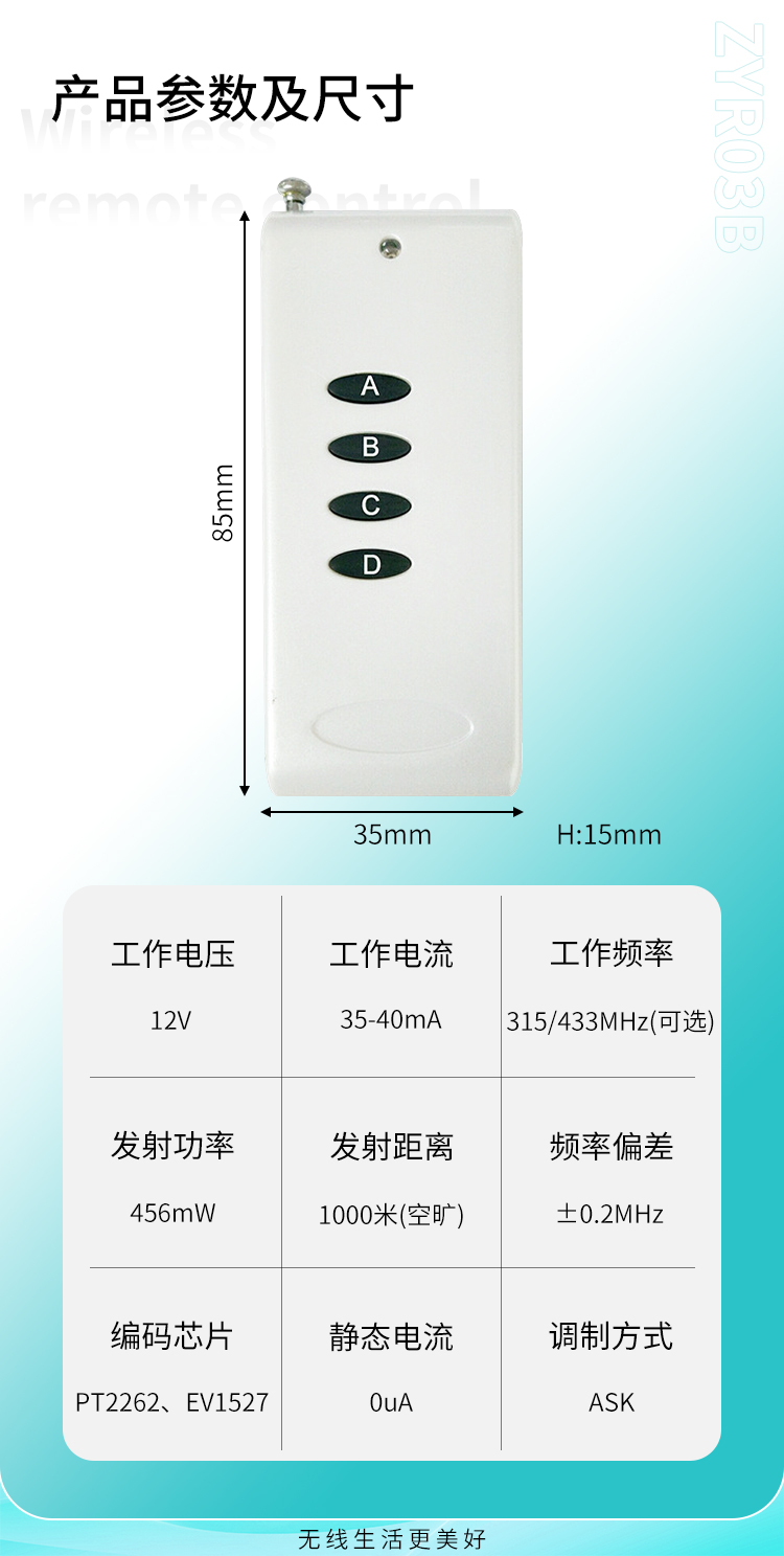 ZYR03B是一款中功率遥控器,体积大,手感好,具有可靠性高、频率稳定、穿透能力强等特点;