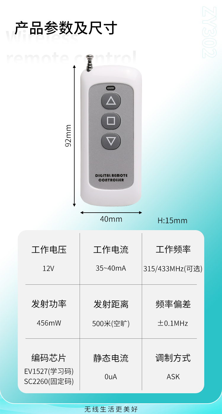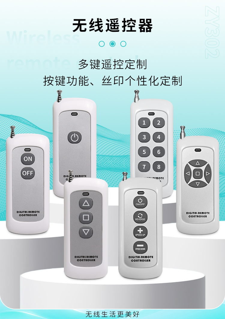 ZY302是一款中功率遥控器,多种按键规格可以选择,具有可靠性高、频率稳定、穿透能力强等特点;